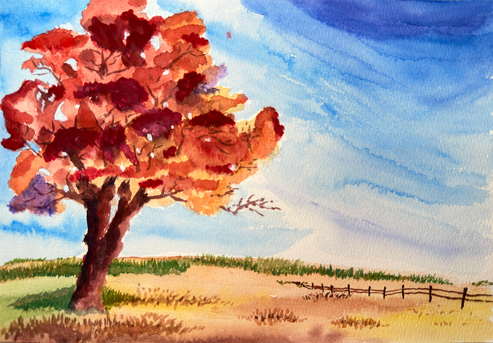 第三幅水彩 有了前張「黑洞」的經驗 但還沒學乖 又用筆救來救去 左邊的樹 差點又變成「黑洞」啦